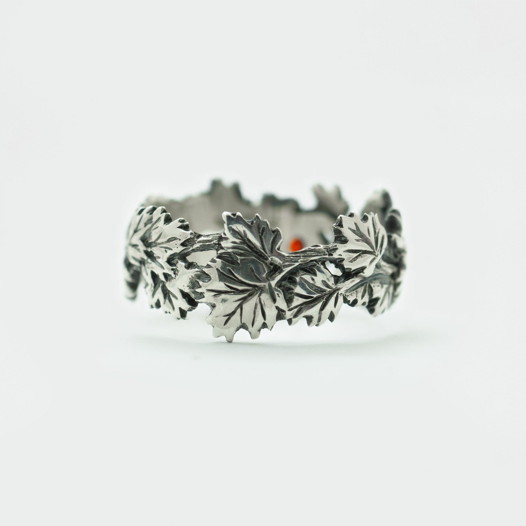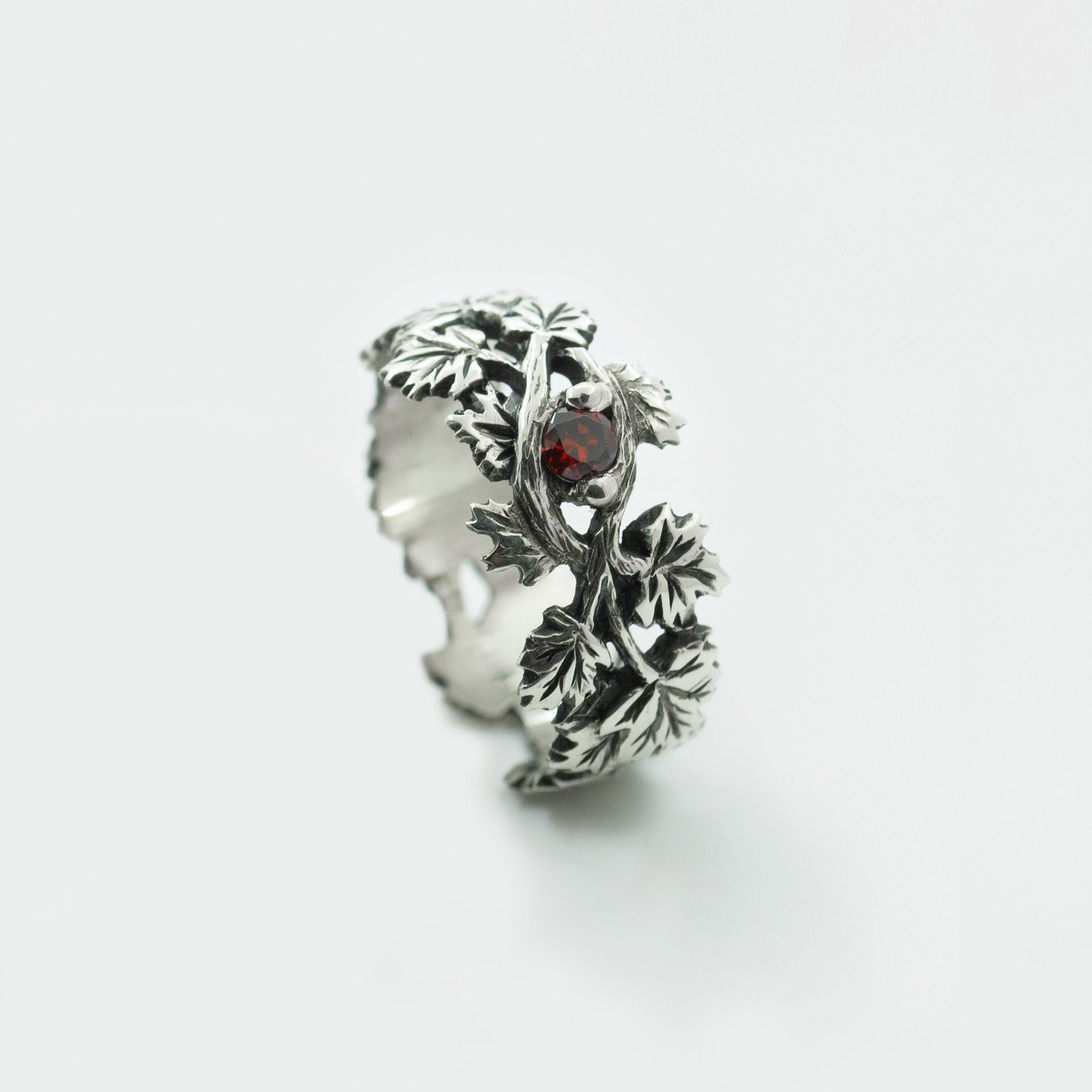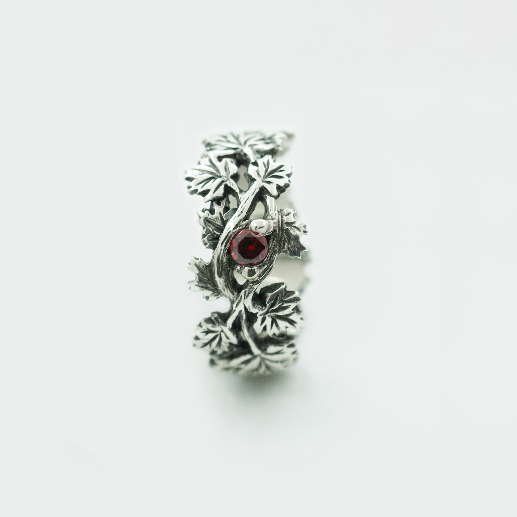 Oxidized Sterling Silver Maple Leaf Ring: Red Cubic Zirconia